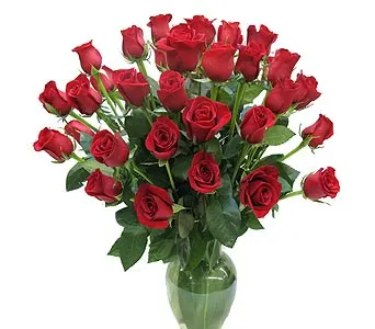 2 dozen beautiful red roses arranged in an elegant clear vase.