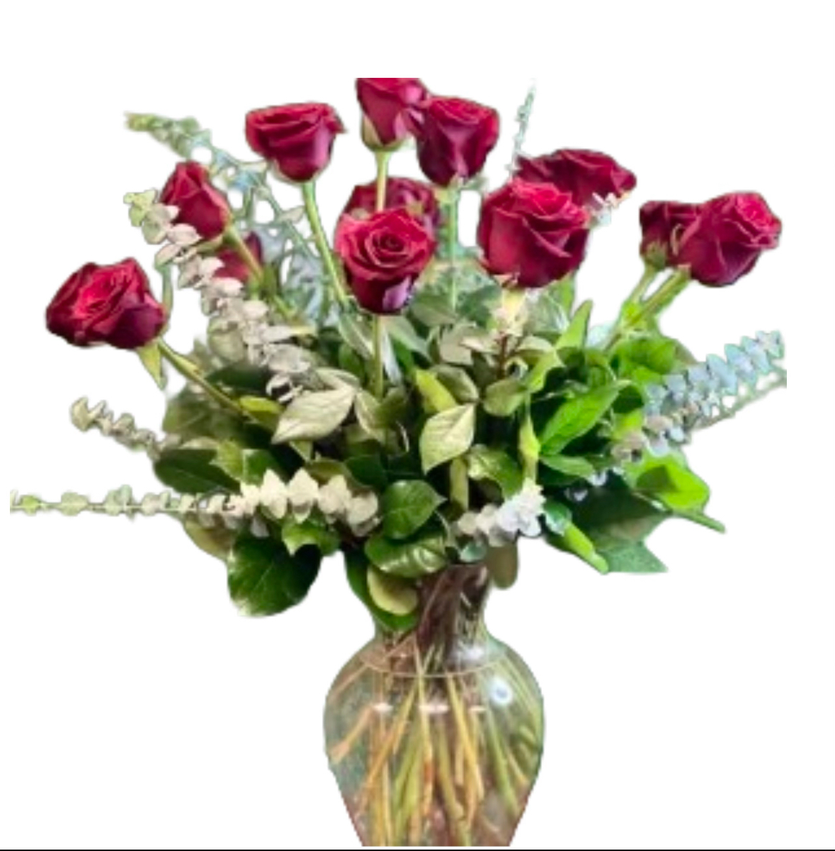 Dozen luxury red roses with greenery arranged in a clear glass vase.