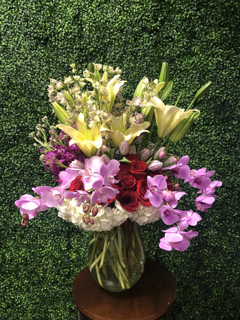 Red roses, white hydrangeas, purple orchids and white lilies arranged in a clear vase.