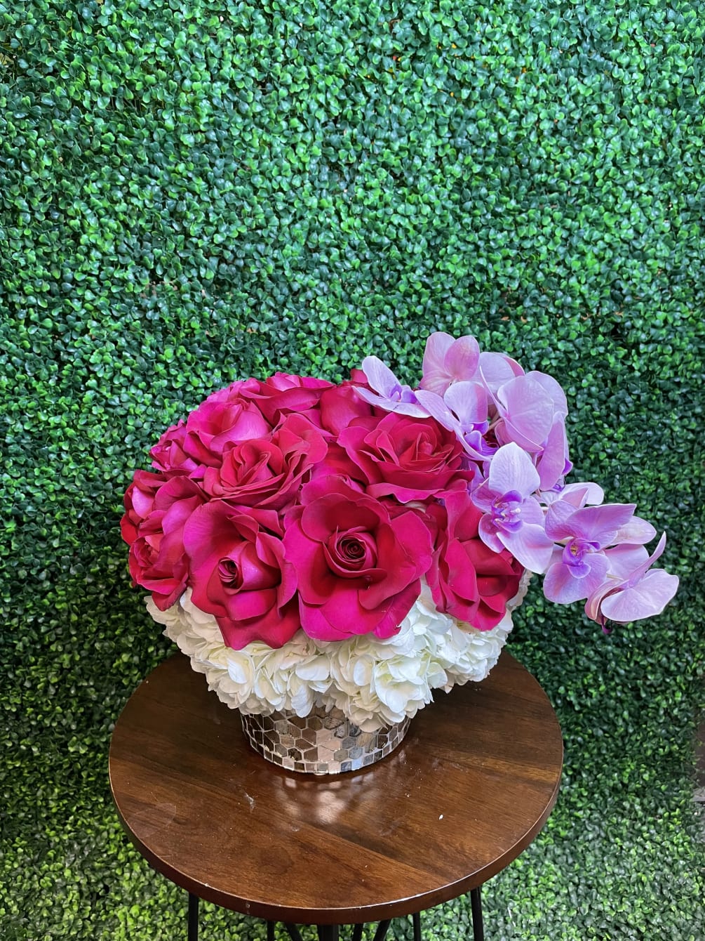 Lovely roses, white hydrangeas and purple orchids in a custom vase.