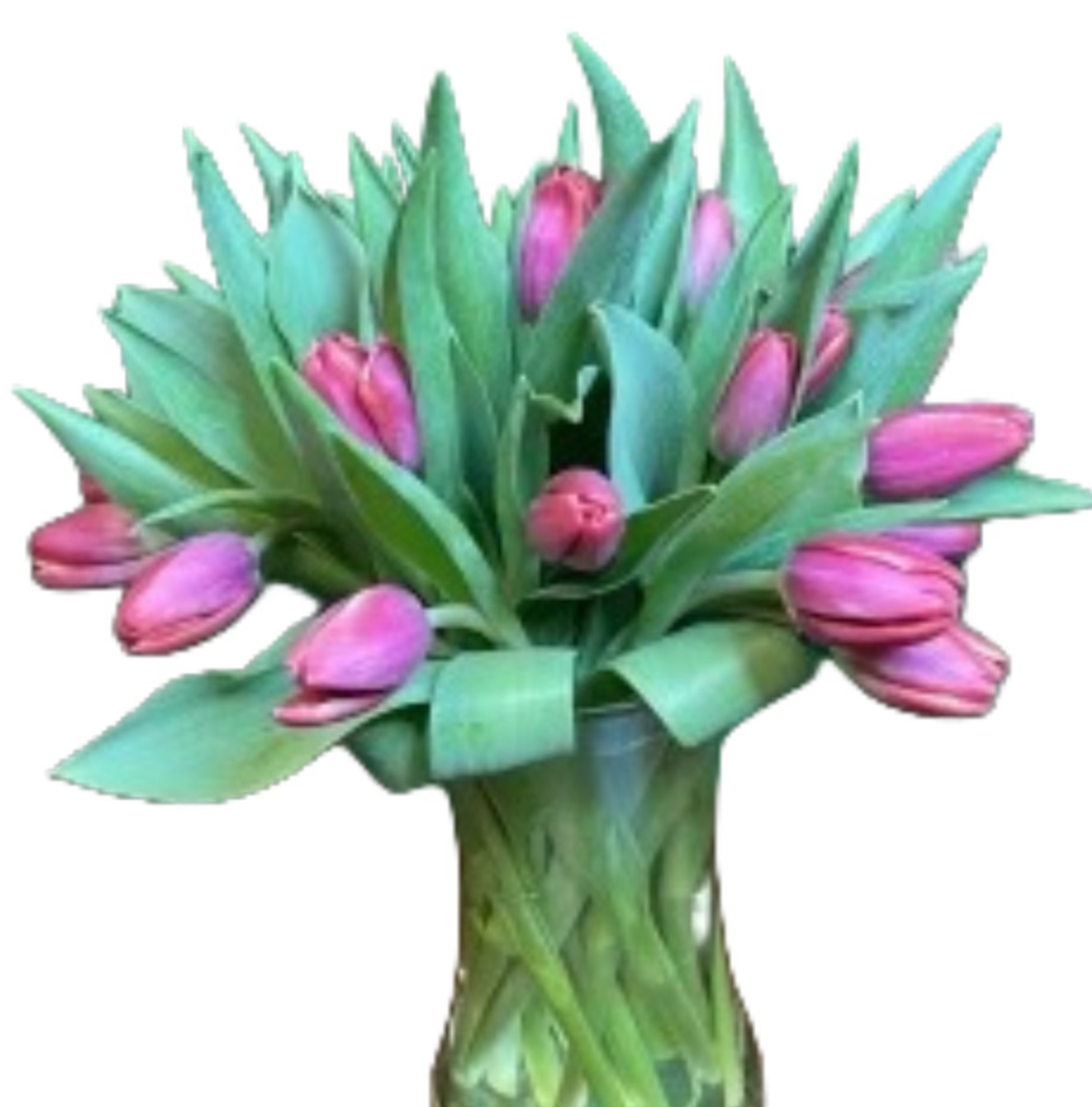 A beautiful elegant arrangement of tulips in a beautiful clear vase.