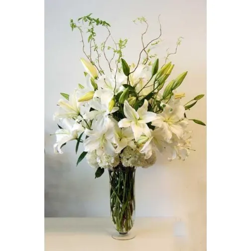 white lilies, hydrangeas and curly willow intertwine in a beautiful display.